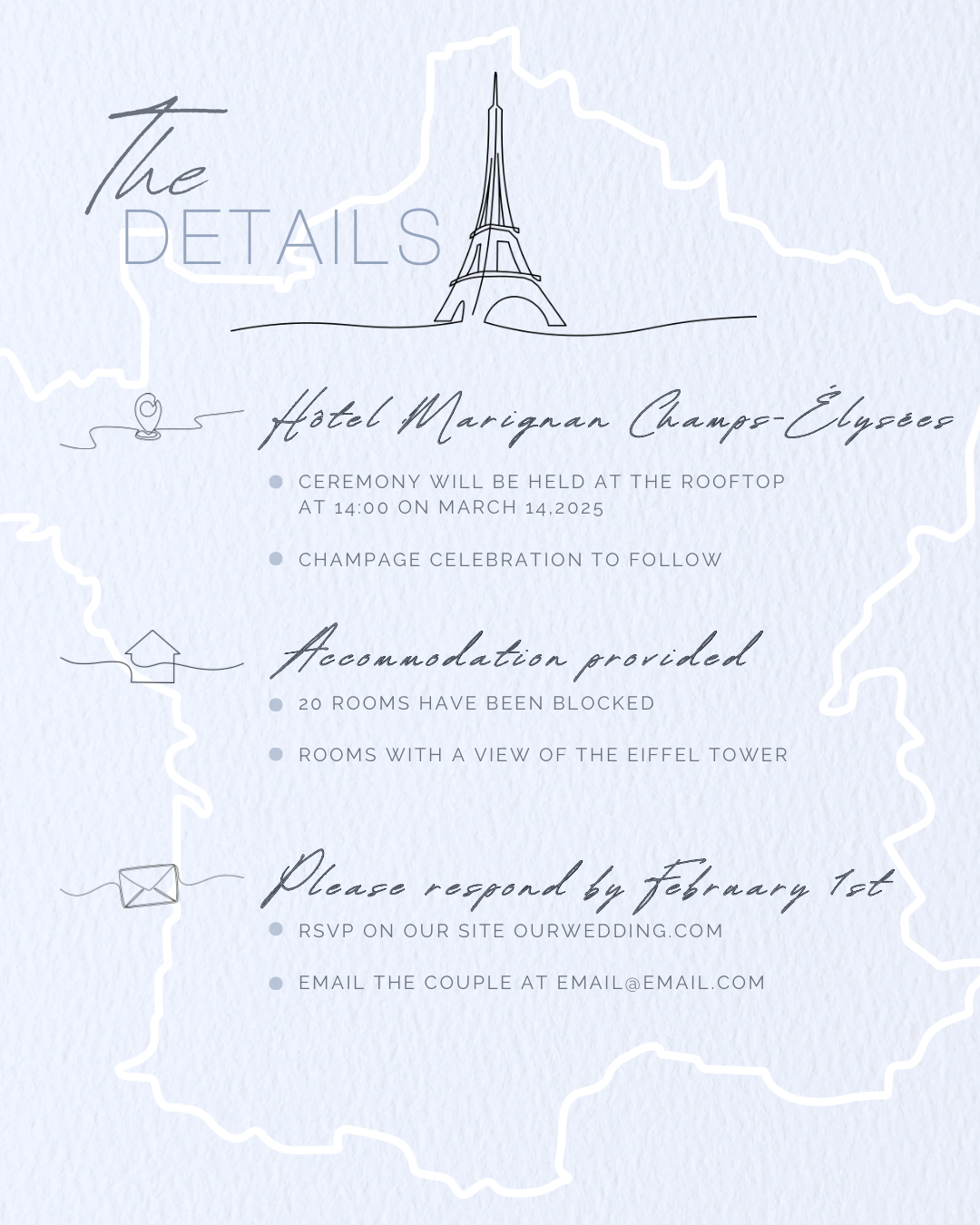 Planning your special day in Paris? Elevate your digital invites with our customisable templates! With three Azure No. 1 palette templates and editable text options, add a soothing touch to your invites and make them truly stand out.